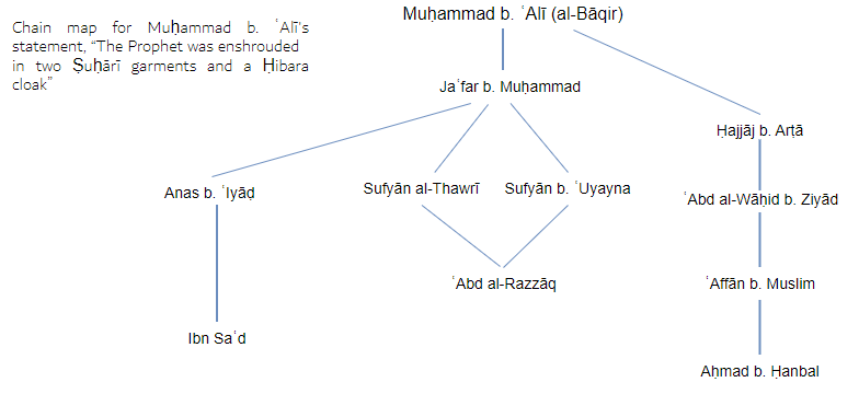 [15] Al-Sunan al-Kubrā, v. 7, p. 239, n. 6758 (https://shamela.ws/book/148486/3945). A version of this report transmitted by Ibn Saʿd has the wording ‘reddish cloak’ as opposed to ‘Ḥibara cloak’. See Al-Ṭabaqāt, v. 2, p. 248 (https://shamela.ws/book/146/728). Note that the two Ṣuḥārī garments were white in colour and the Ḥibara cloak was reddish in colour as will be demonstrated in this paper (see the report referenced in footnote 24), so there is no contradiction. See also ʿAbd al-Razzāq in his Muṣannaf, v. 4, p. 151, n. 6356 (https://shamela.ws/book/84/1798) and from him Aḥmad in his Musnad, v. 5, p. 53, n. 2861 (https://shamela.ws/book/25794/2061) but read ‘thawbayn abyaḍayn’ for ‘burdayn abyaḍayn’ as is correctly quoted by Ibn Kathīr in his Al-Bidāya wa-l Nihāya, v. 8, p. 129 (https://shamela.ws/book/4445/4268).