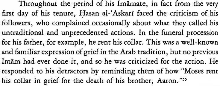 Modarressi applies this criterion across his study of al-ʿAskarī, carefully reading through all the relevant material and isolating those elements which are deemed ‘embarrassing’ to form the bed-rock of his portrayal, beginning with al-ʿAskarī’s “unprecedented action” of “renting his collar” for which he was “criticized” on the “very first day of his tenure”.